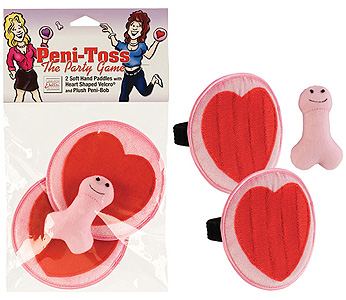 Бадминтон в эротической интерпретации. Две подушечки-ракетки закрепляются на ладонях с помощью ремешка. Маленький плюшевый пенис играет роль воланчика. Липучки в виде сердец на "ракетках" помогут не потерять "воланчик" в течение игры. Не знаю, интересно ли это, но у "пениса-воланчика" выражение лица очень довольное.