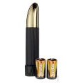 Пластиковый вибратор черного цвета, до половины с выпуклой ребристостью, дальше золотистая гладкая металлическая головка. Оснащен функцией плавной регулировки вибрации.